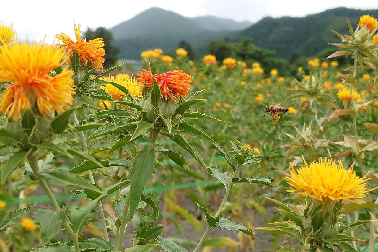 目の前にはミツバチ?が飛んでたんだけど、足には紅花の物かわからないけど花粉が団子みたいに着いてたねw(゚o゚)w!!