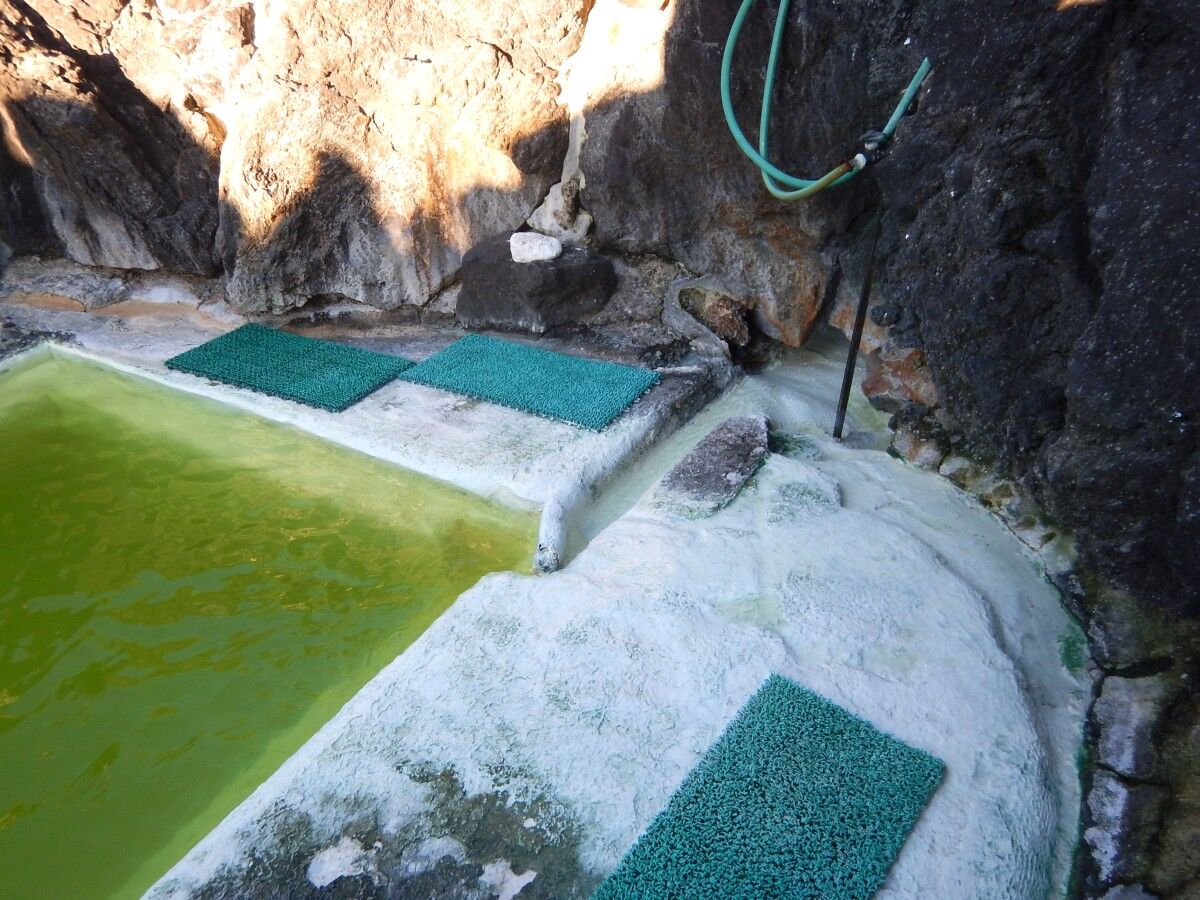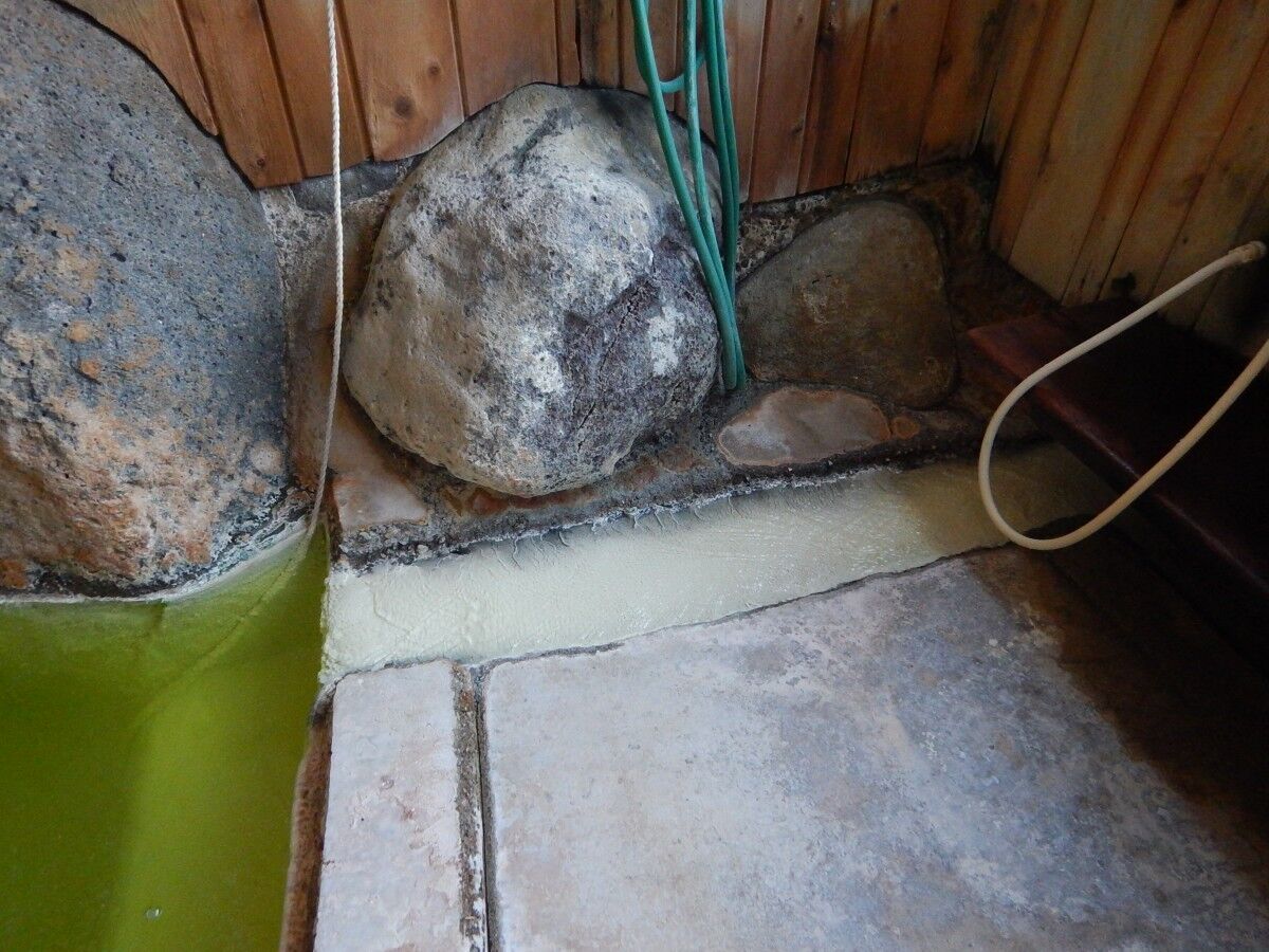 内湯以上の析出物で、底だけでなく壁や栓を繋いだロープまで覆われていました。