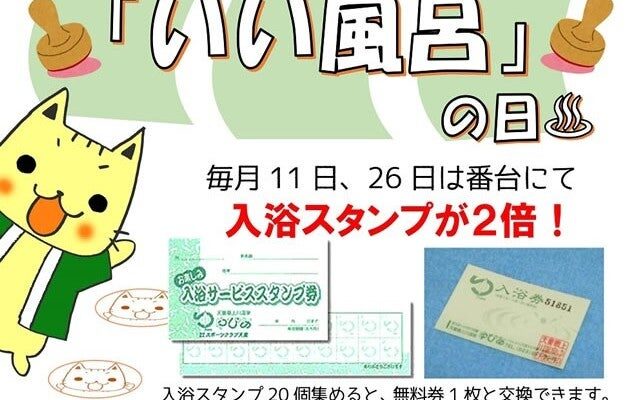 明日は♨Source【天童最上川温泉 ゆぴあのブログ】-------------------------------------明日は26日、【いい風呂の日♨】入浴サービススタンプ券のスタンプ2倍デー…