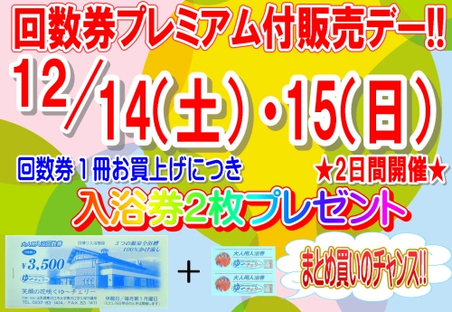 ★回数券プレミアム付販売デーのお知らせ★Source【ゆ~チェリー】-------------------------------------入浴回数券がお得に購入できる『回数券プレミアム付販売デー』今年最後の販売は、12…