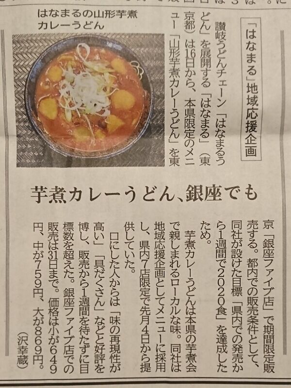 はなまるうどんの銀座ファイブ店に、山形のソウルフードの雄「芋煮カレーうどん」がいよいよ登場(*´∀`)♪