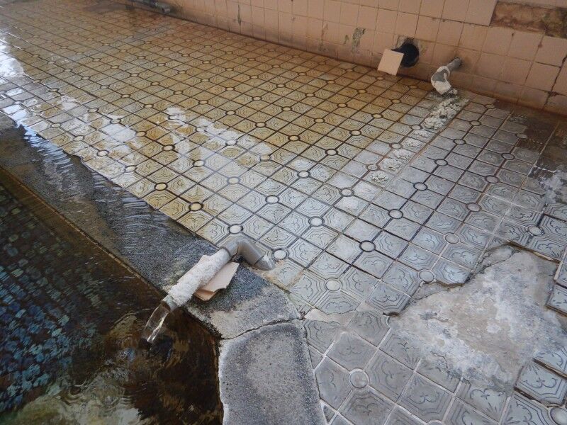 こちらも壁から一度床下を通っているのですが、何故か床上に析出物が花を咲かせています。