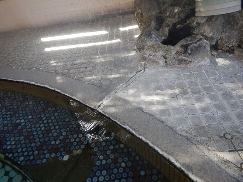 浴槽の縁が何か所か低くなっており、そこからサワサワとオーバーフローしていました。