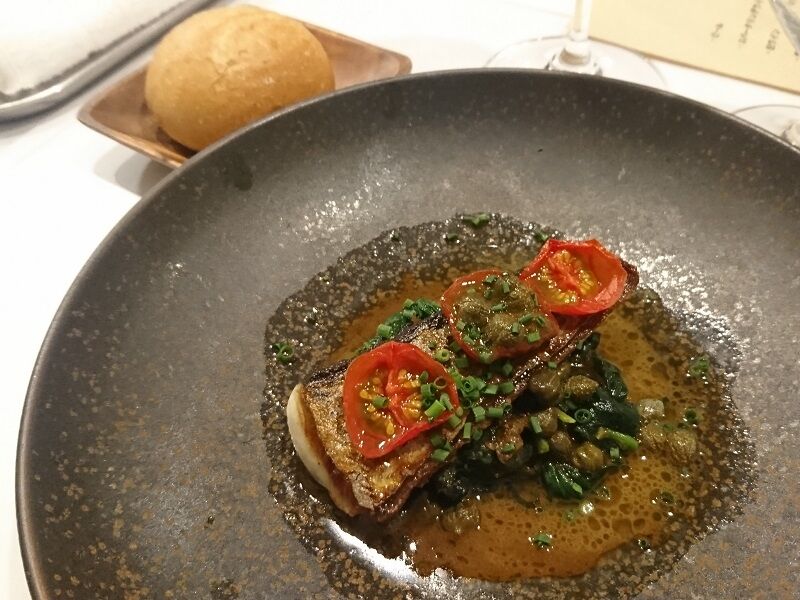 そして魚料理が、鰆の焦がしバターソースにアンチョビ、ケッパー、セミドライトマト。