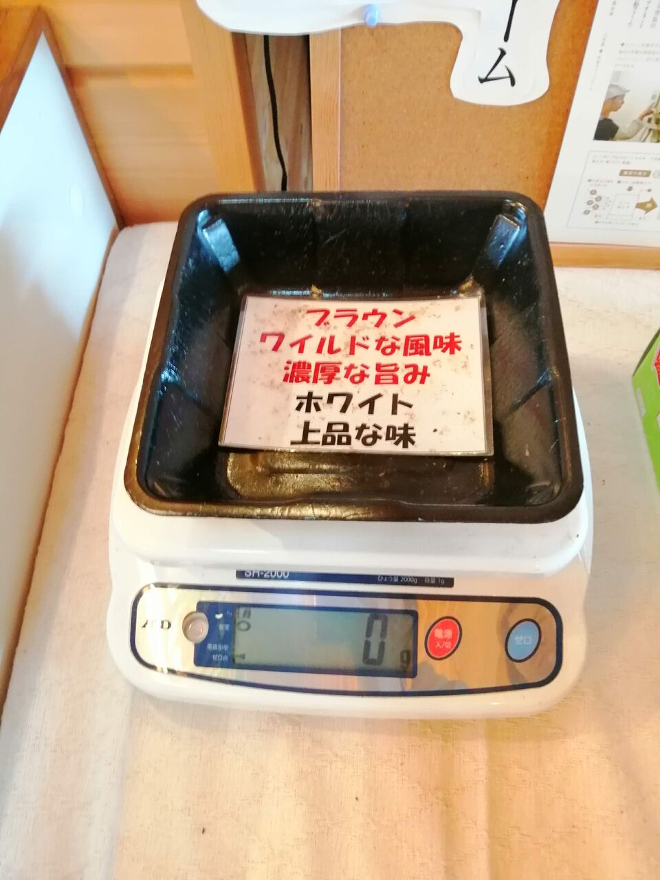 かごに入っているマッシュルームの隣に量りが用意されていて好みの量を量り売りで買うことができます。