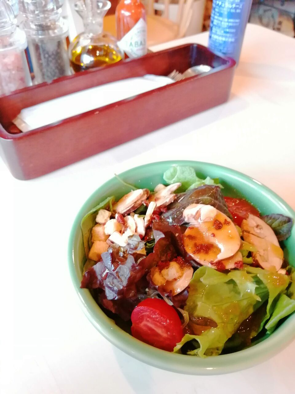 レタスやトマトの上にスライスされた生のマッシュルームが乗っています。生のマッシュルームを食べるのは初めて。きのこ特有の臭みはなく旨味だけが感じられます。これは美味しい♪