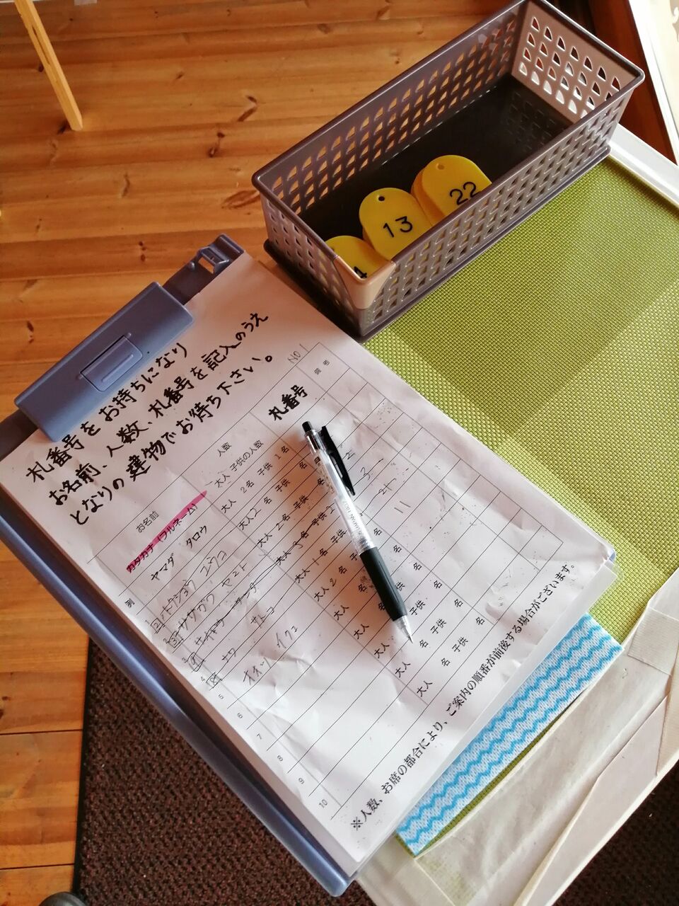 入口をくぐったところにレストランの順番待ちの名簿が用意してあります。名簿脇においてある黄色い札を取りその番号を名簿に記入して予約します。