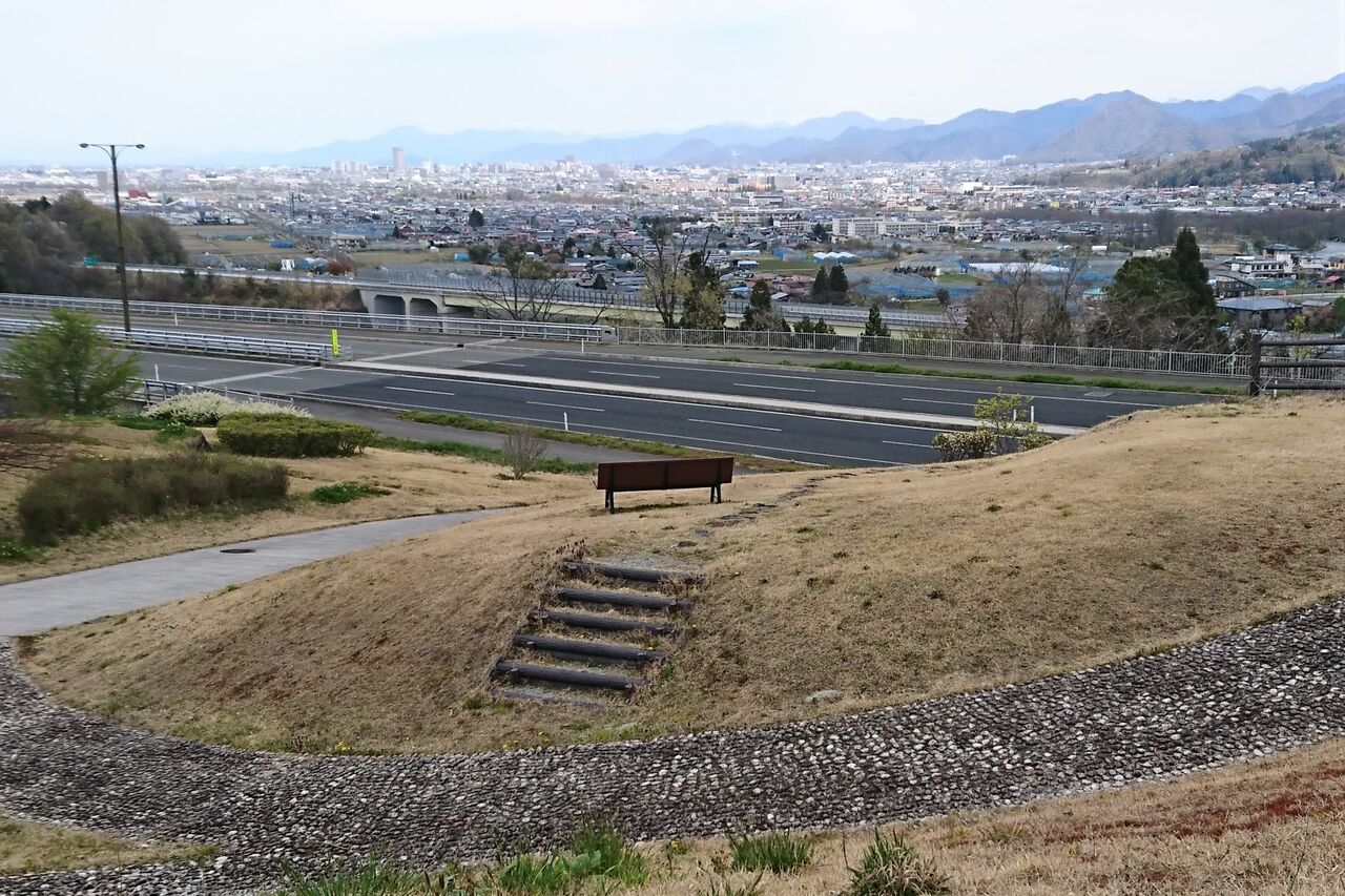 これは、みはらしの丘で散歩中に見つけたベンチ。道路のはるか先にはセントラル。