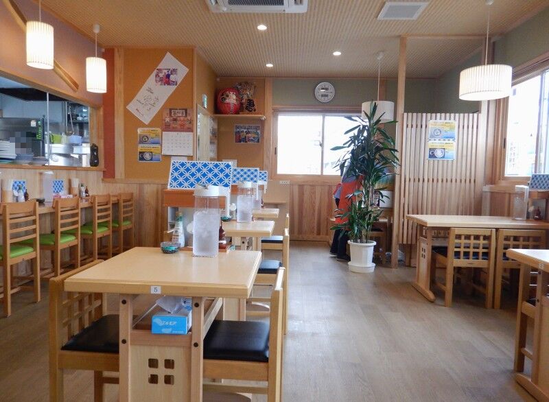 テーブル席が並び、厨房前にはカウンター席も並んでいます。