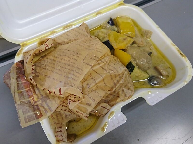 確かに、このシャバシャバなグリーンカレーをこの容器に入れてほかのランチBoxの上にそのまま乗せたら・・・そりゃ持ってくる間にこうなって当然だわな(-“”-;)