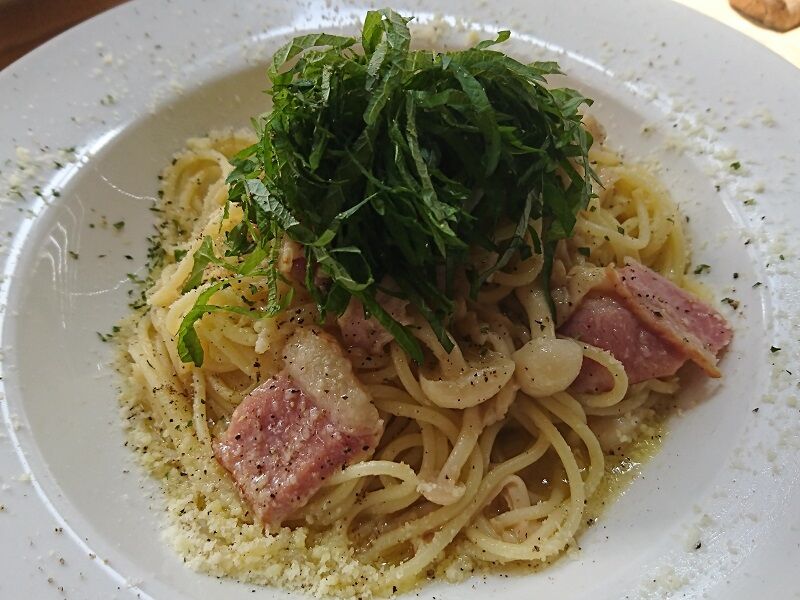 で、僕が頼んだのはこのベーコンと大葉の塩味スパゲッティ、みたいな感じのヤツ(*´ω`*)