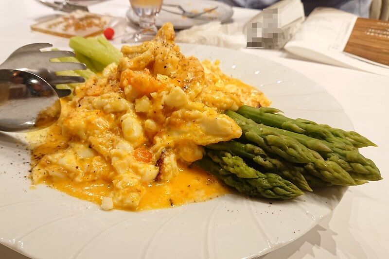 続いて、熊谷農園のアスパラガスと紅花たまごのビスマルク風。