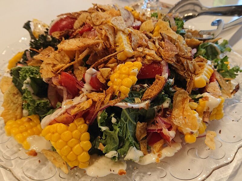 最初の料理は、ケールととうもろこし(ゴールドラッシュ)のサラダ。クランチガーニッシュ添え、大豆ヨーグルトのドレッシングだそうです♪