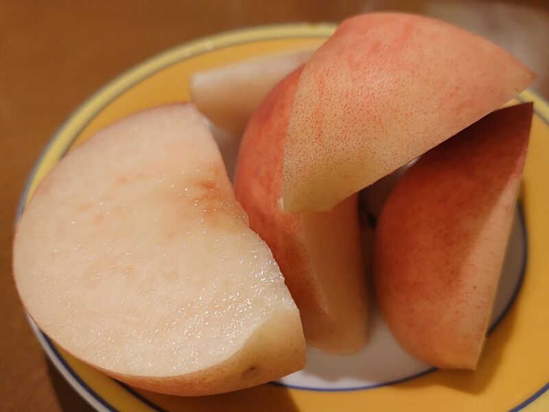 福島では固い桃を皮がついたまま食べるんだ、って聞いたことがあったけど、この品種だったのかな?