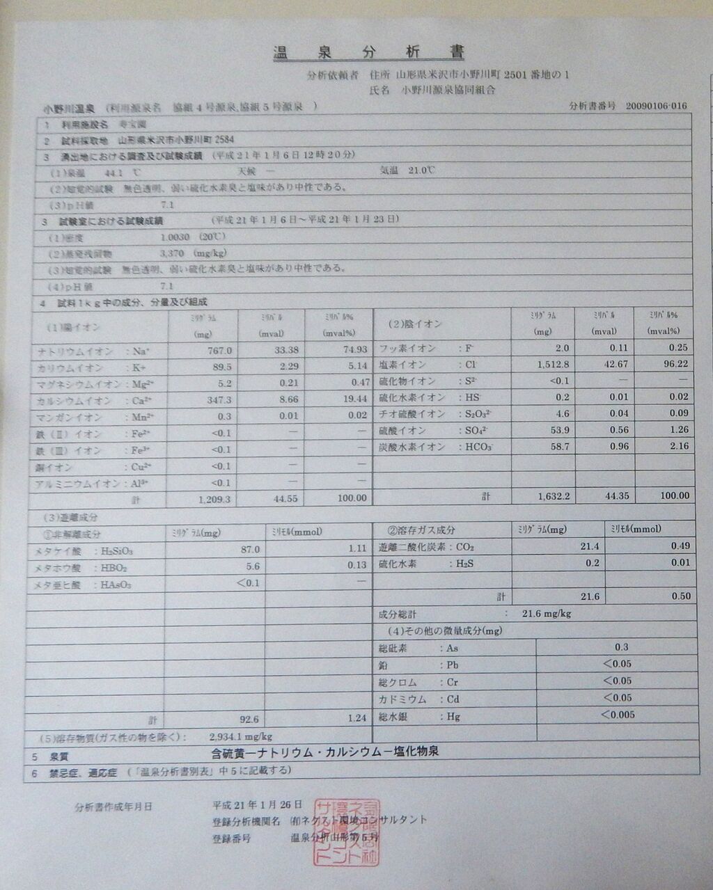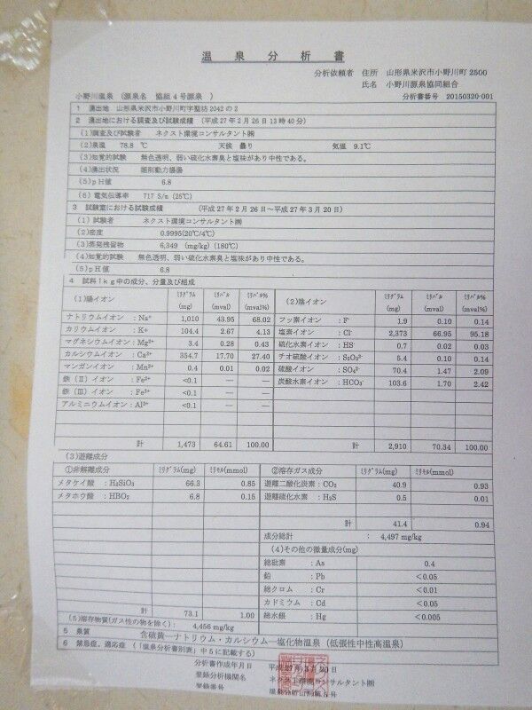 成分表は脱衣所の入口に、集中管理している4号源泉と、4号&5号を混合後の成分表の両方が掲示されていました。