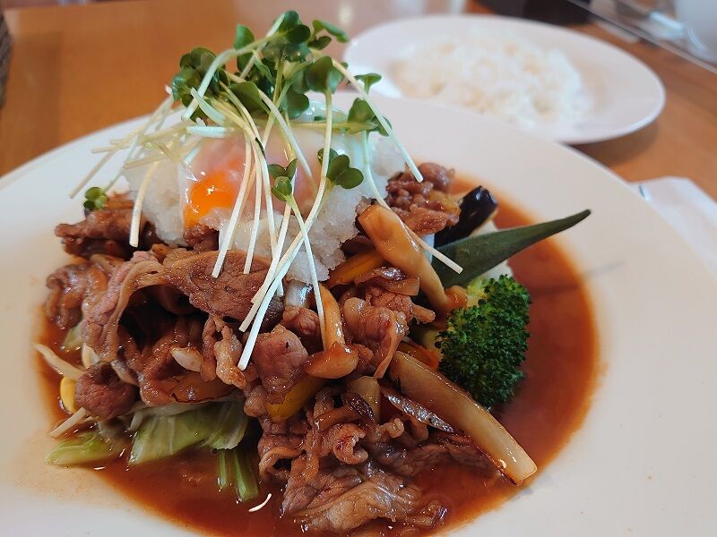 Dランチ、たっぷり野菜のビーフのソテー ラジウムエッグ添え 和風おろしソース、です!