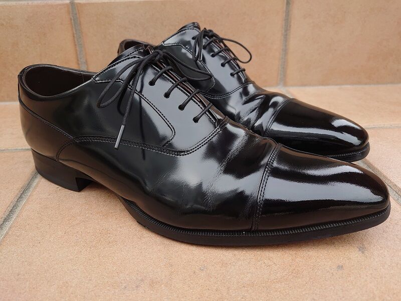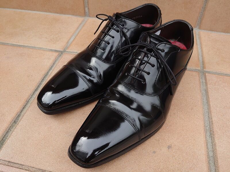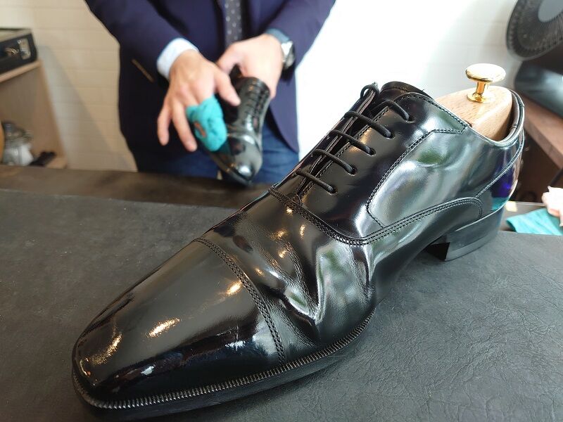 つま先部分の輝きと、横から見たときのコバに近い部分をつま先から踵にわたって立体的に輝かせるのがプロの技。磨き方にもちゃんとデザインが施されていることにまた驚いたよ。