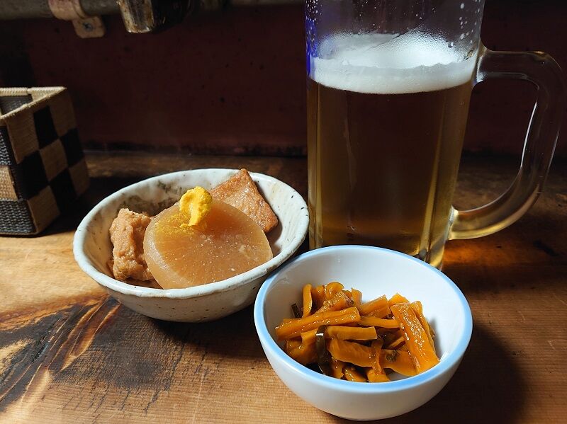 お通しは手前の漬物風の小鉢と、アツアツのおでん。今シーズン初のおでんだψ(`∇´)ψ