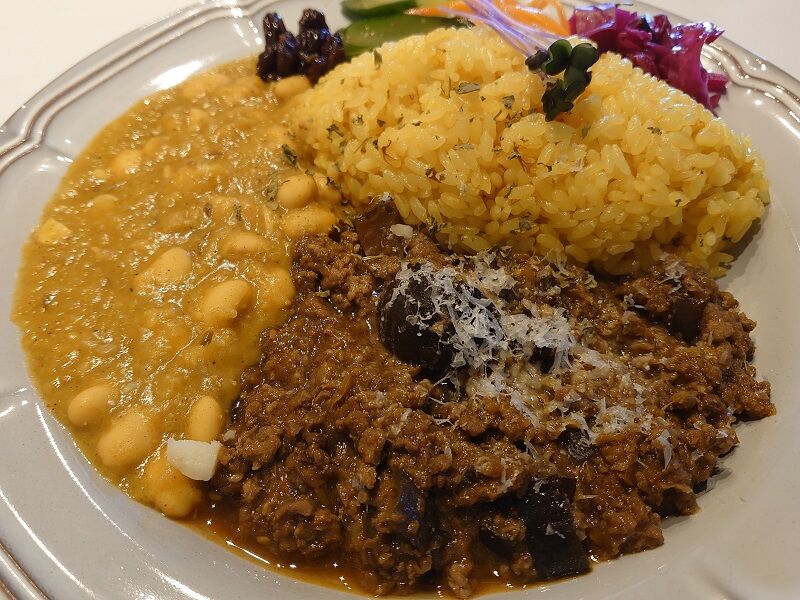 麻婆風秋ナスとラムのキーマカレーと、インド全域で親しまれているというダール豆のカレーの2種相盛り。