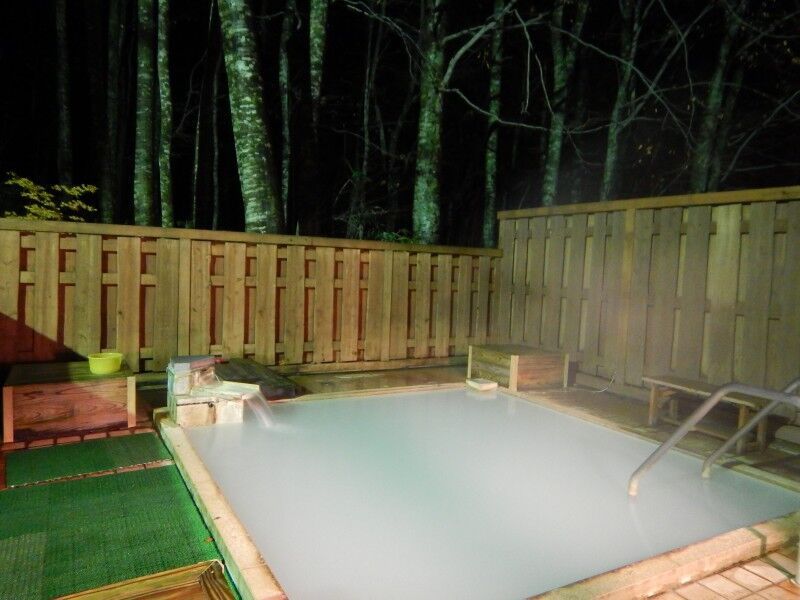 ブナの木に囲まれた露天風呂は夜でもいい雰囲気。