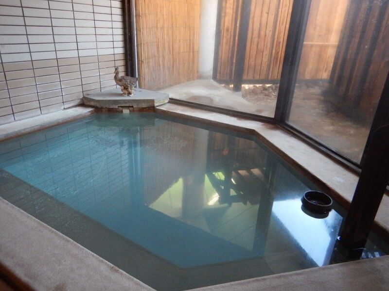 カルガモ親子の乗った湯口から注がれるのは硫黄の香り漂う蔵王の湯。