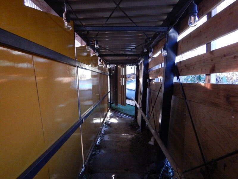 浴室はベニヤ壁の通路を抜けた先にあります。
