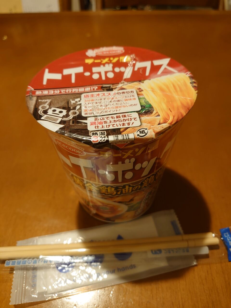 というわけで、今日もしっかり歩いて帰ってきました♪本日の〆は、ウチの冷蔵庫と称されるコンビニで買ってきたこのカップラーメン。トイ・ボックスなんて名前だとあんまり期待できないような気もするけど、「東京屈指」とか「名店の味」とか書いてあるし…