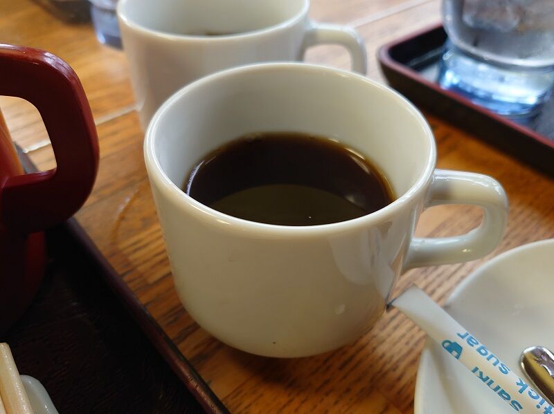 そうそう。こちらの玉子屋さんでは食後にコーヒーのサービスがあるみたいなんだけど、今回は蕎麦を食べ始めて少ししたぐらいのタイミングで持ってきていただいたんだよ。