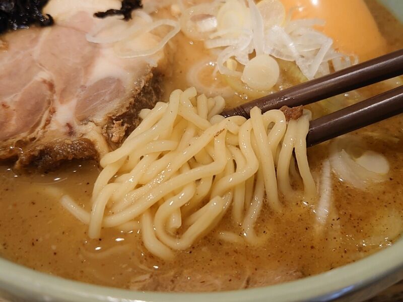 濃厚スープにはどちらかというと太麺を合わせるパターンが多いのかなと思ってたけど、こちらは意外と細めの麺を合わせてるんだね。