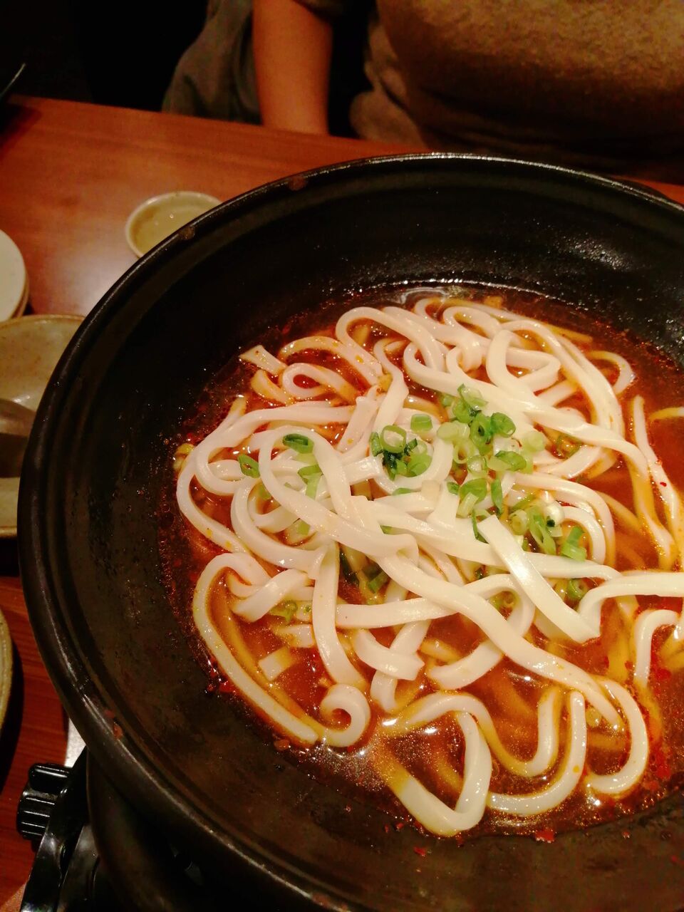 メインの牛カルビのマウンテン鍋は見た目通りピリ辛の味付け。肉の下にはもやしが山盛りになっています。