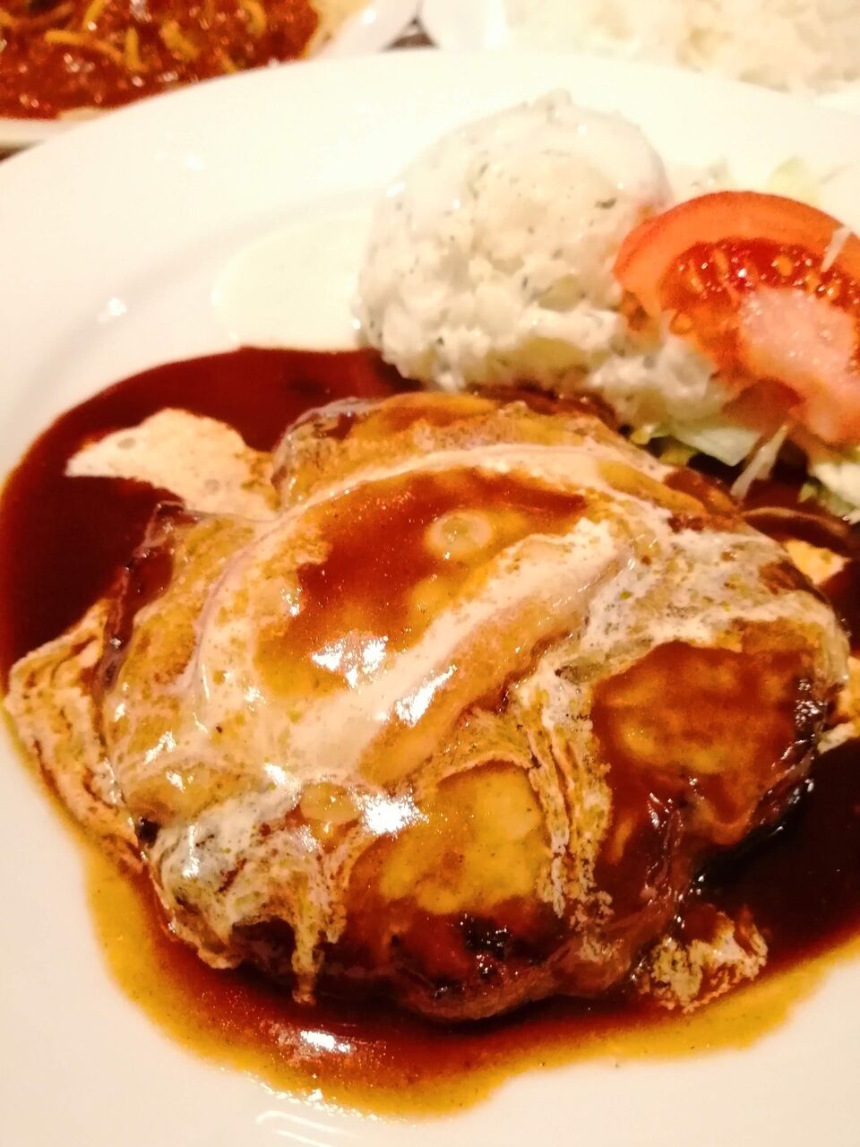 ハンバーグはこれぞハンバーグと言った食感。みんながイメージするハンバーグそのものです。かけてあるデミグラスソースはハンバーグにちょうど良い塩梅。期待を裏切らない味わいです。