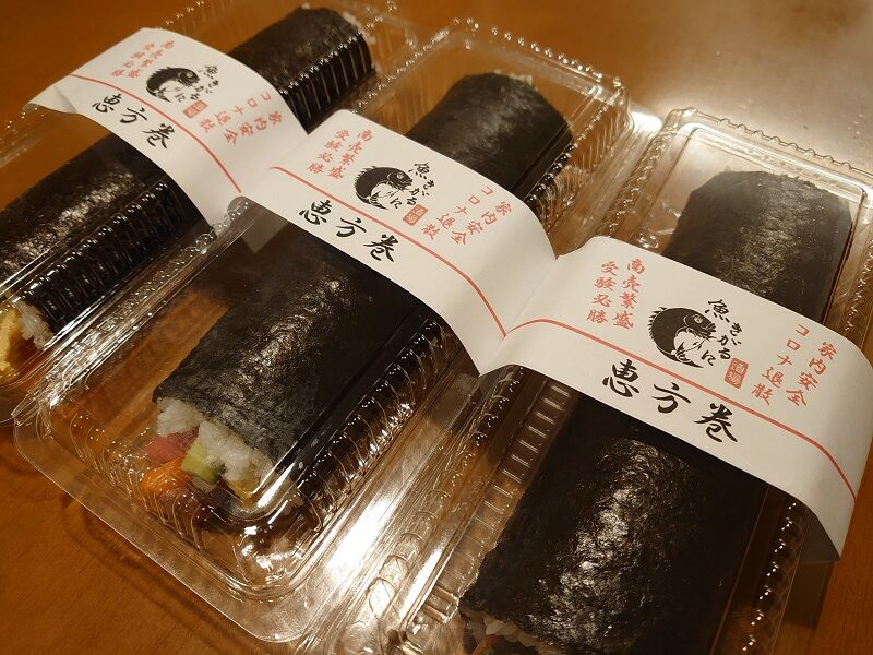 こちらはいま新型コロナウイルスの影響で臨時休業となってるんだけど、この恵方巻は今日だけの予約販売ってことで注文を受けてたんだよね。