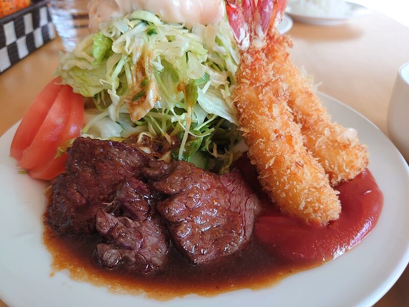 牛肉のステーキとぷりぷりエビフライ。肉と魚から一品ずつ、みたいなψ(`∇´)ψ