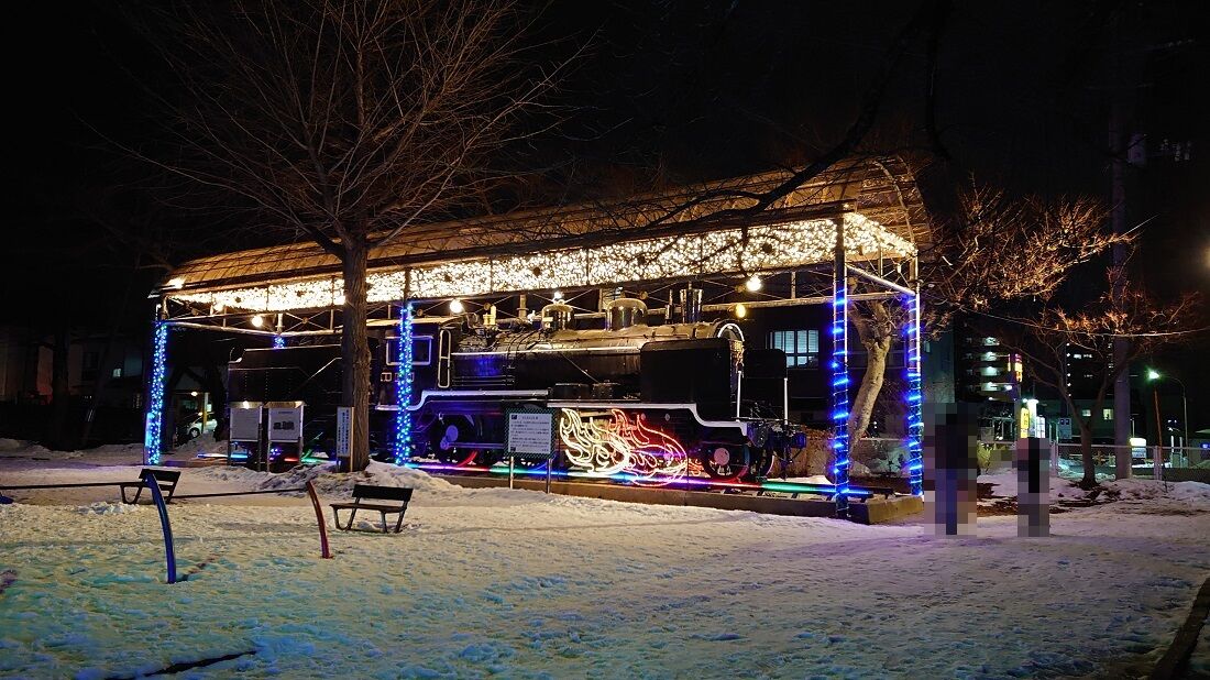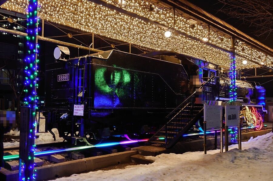 前は藤棚のイルミネーションだけだったけど、後ろのSLにも何やら電飾の灯りが!