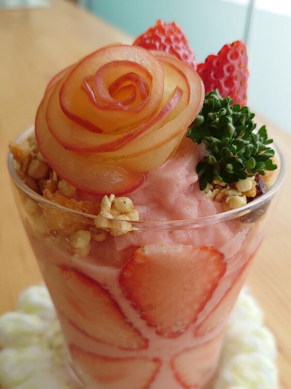 でもガラス容器の側面に飾られたこのイチゴだって素晴らしい存在感を放ってますよ♪