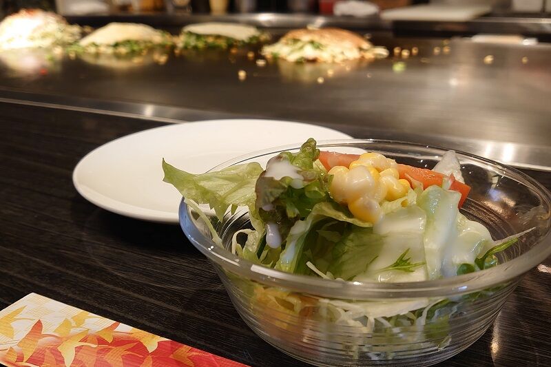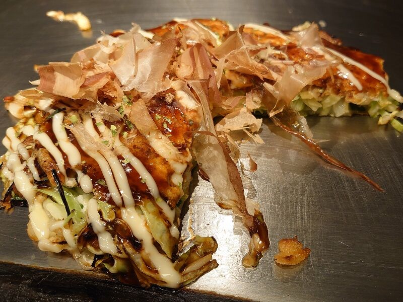 カウンターの場合、目の前の鉄板にお好み焼きがサーブされて取り皿に取って食べる形になるんだよね。でもこの場合、例のコテで細かく切るのはこの鉄板の上でやってもいいのか?