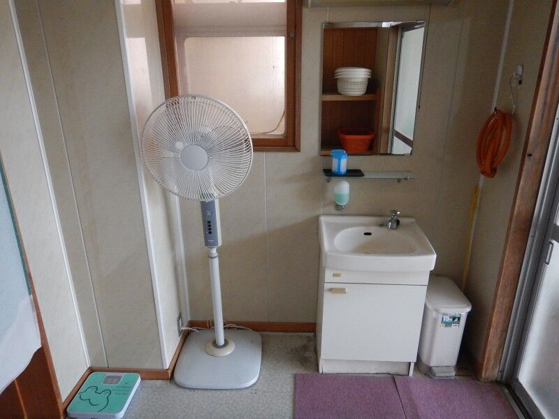 脱衣所には棚のほか、洗面台があります。