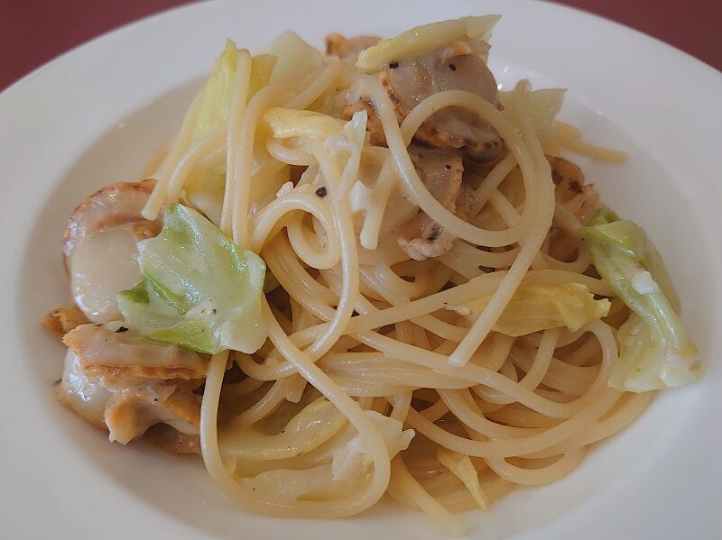いくつかのメニューから選べたんだけど、僕はホタテと春キャベツのクリームパスタ。