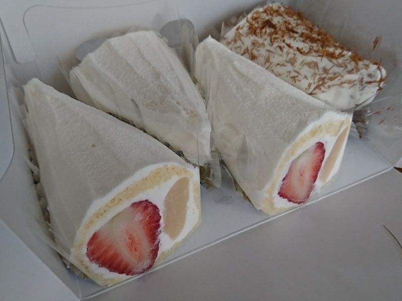 ふわふわのスポンジに包まれているのはイチゴと・・・なんだろ?