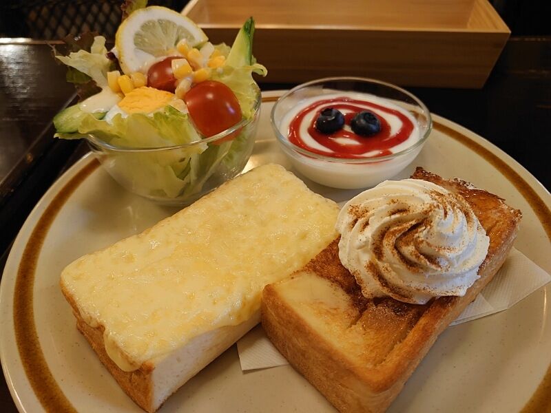 チーズ&生クリームシナモントーストにサラダとヨーグルト、そして本日のコーヒーがセットになって税込み1000円。