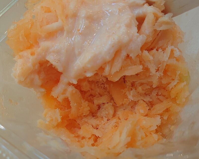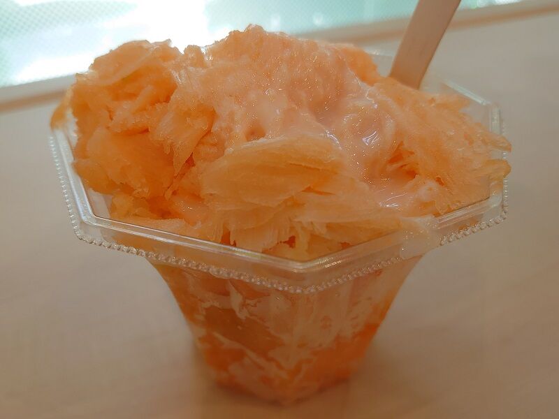 今日のフルーツはメロンだったんだけど、ご覧のとおりオレンジ色のメロンの果肉を凍らせて、それをそのままかき氷にしてあるんだね♪