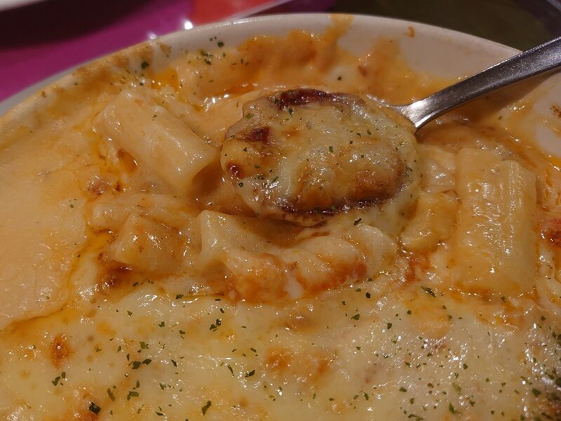 たっぷりチーズの下には、マカロニをはじめとした数種類のパスタ。捻ったやつとかストレートのストロータイプとかがあったけど、こういういろんな形を全部ひっくるめてマカロニっていうのかな?