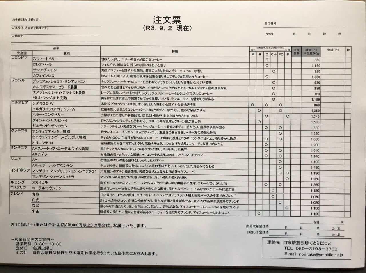 こちら、9/2現在のコーヒーリストです。お店のfacebookから借用しました(^^;