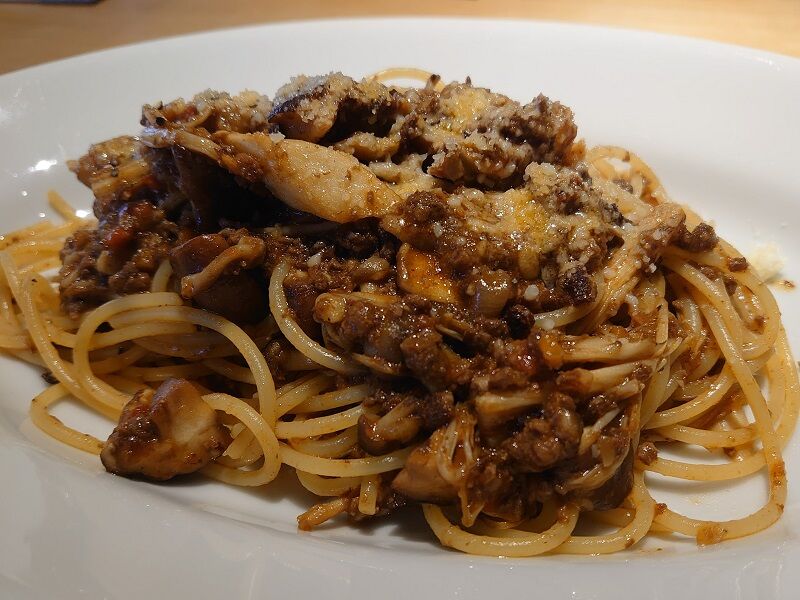 ずいぶん迷った末に僕が選んだ本日のパスタは、山形牛ひき肉とキノコ(エリンギ、舞茸、椎茸、エノキ、しめじ)のボロネーゼスパゲッティ♪