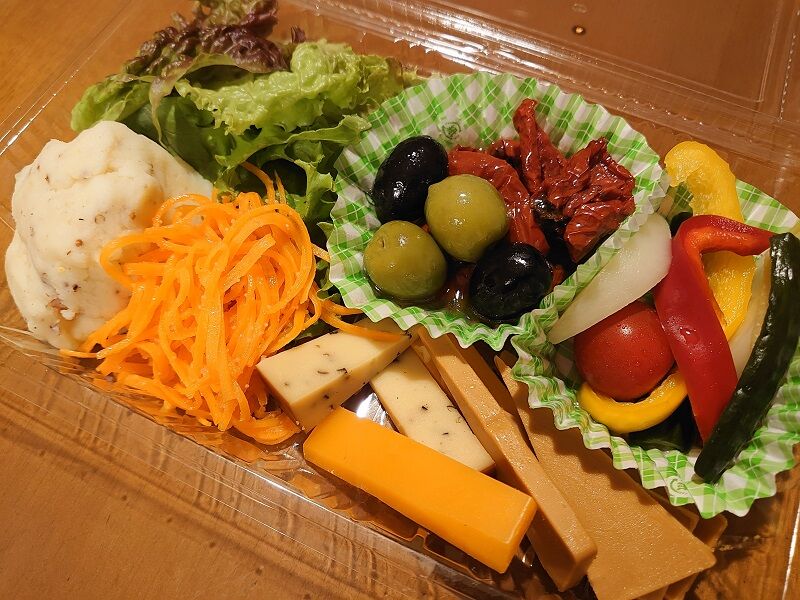 チーズにピクルス、オリーブにドライトマト、キャロットラペにポテトサラダ。