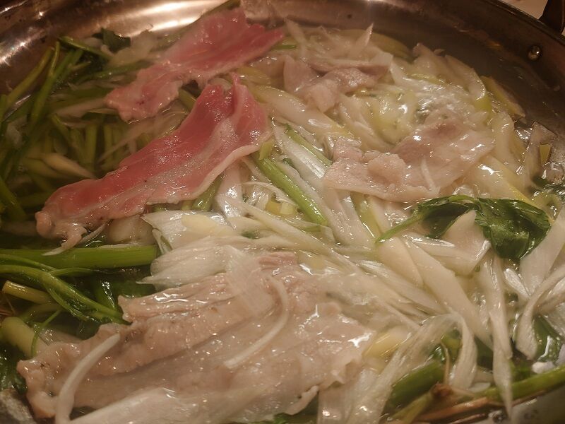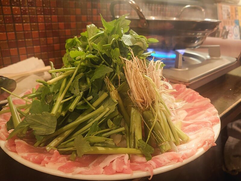 セリとネギを先に投入し、豚肉はしゃぶしゃぶ風に熱を入れて、野菜をくるんでパクリ。