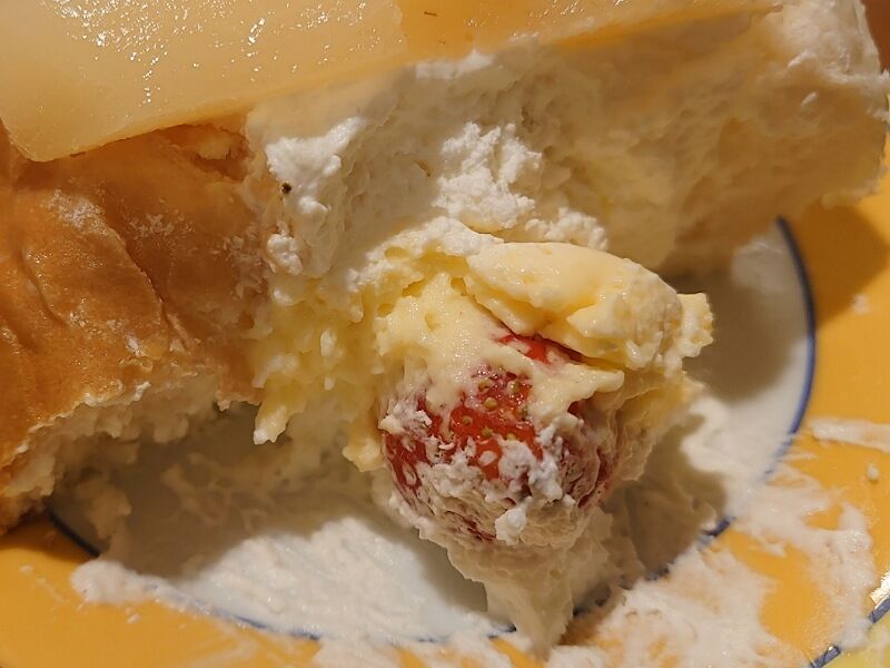 挟んであるクリームの部分は、生クリームとカスタードが併用してあるんだね。そしてその中にイチゴやバナナが隠れてます♪
