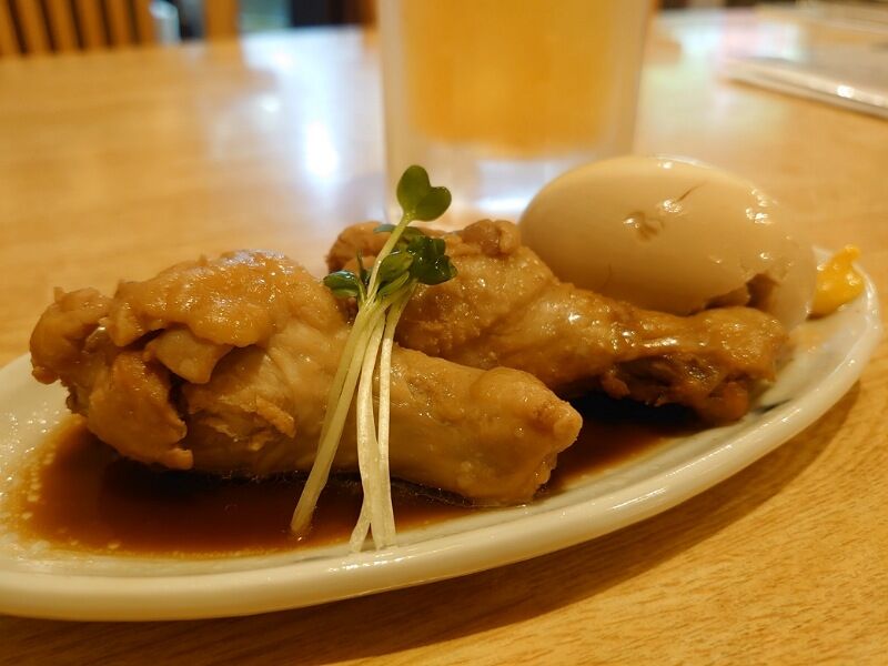 そして手羽の醤油煮と半熟味たま。手羽先を煮たやつは家でも奥さんがよく作ってくれるんだけど、こちらの手羽は必要以上に煮込まず身がプリっとしてる。