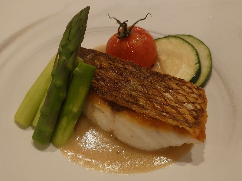 真鯛は皮がパリッと香ばしく仕上げられていて、身はふっくらと柔らかい。そしてブルーブランソースって言ってたと思うんだけど、バターのコクが濃厚なソースでこれがまたとっても美味しかった♪