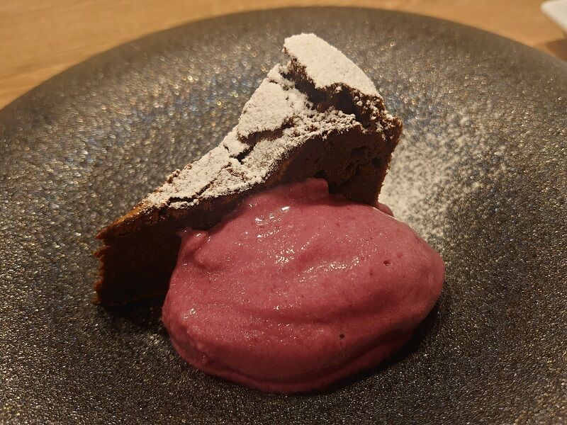 そして肝心のデザート(デセールというべき?)は、ガトーショコラと県産ぶどうのソルベ。